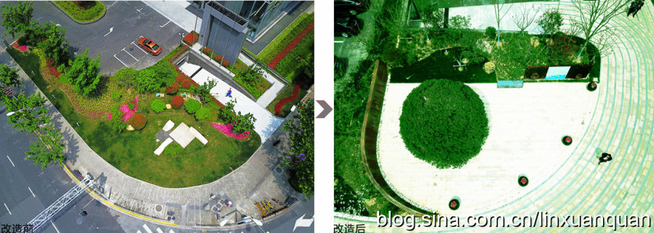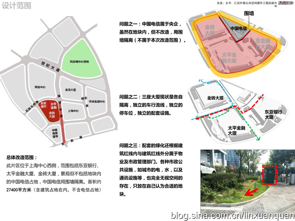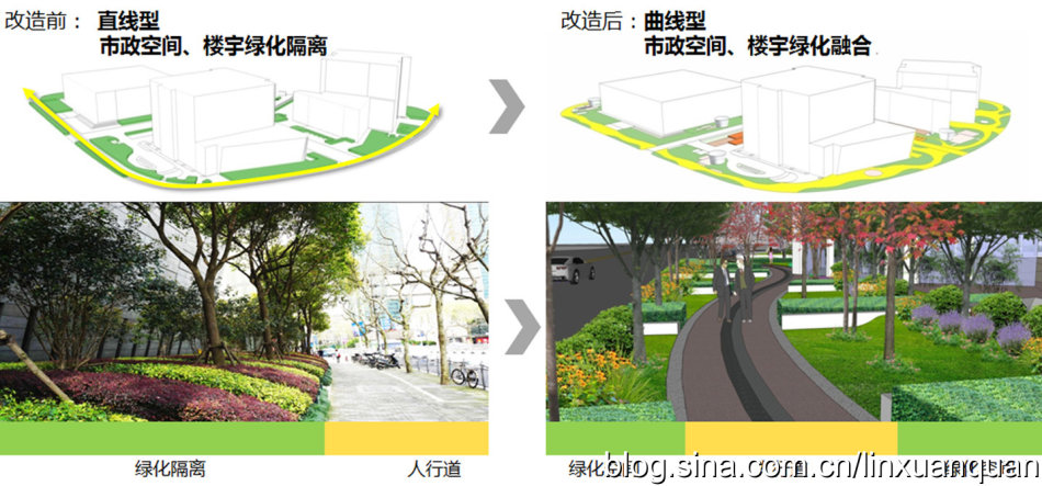 比如金磚大廈一個完整的綠化帶,可以一半是屬于樓宇管理,另外一半是屬于市政部門來管理,在綠地中間設置一個低矮的欄以示邊界,同時,各種市政公共設施,如城市的電,水,以及通訊設施等的一些設施,也完全無視空間的存在,只放在自己認為合適的地塊。這次在改造中,對于各種城市的各種基礎設施無序擺放,以及丑陋的外觀,目前只能進行一些遮擋式的修飾,位置還沒有辦法進行統(tǒng)一的規(guī)劃及擺放。