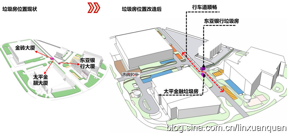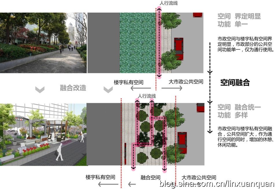 對于該改造也是如此。各個大廈是以建筑紅線為基準,在各自的地塊內設置車行道,停車場及相關的配套設施如垃圾收集站等,綠化成為空間的“軟分割物”,因此建筑與建筑之間的空間完全沒有使用價值,僅僅只是通行的功能。