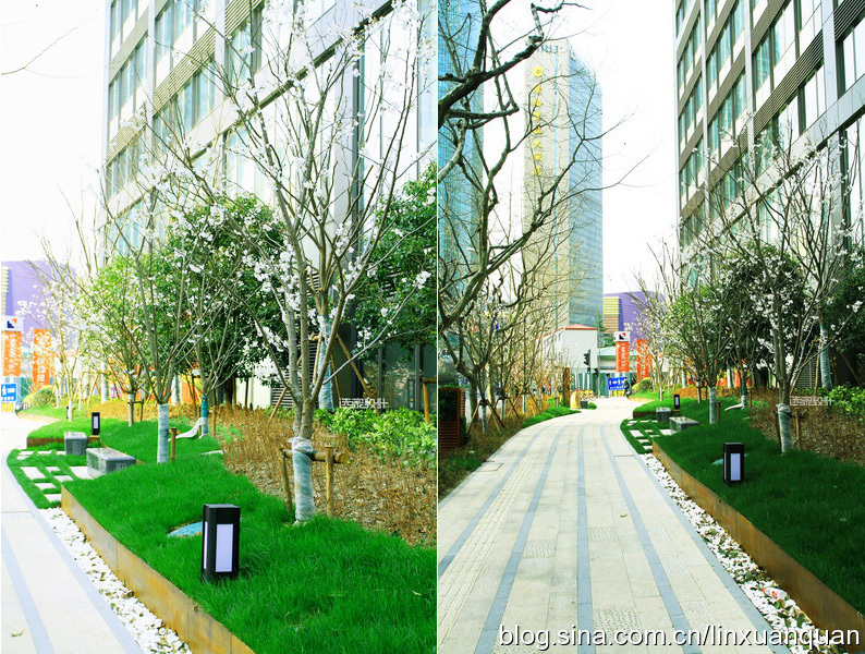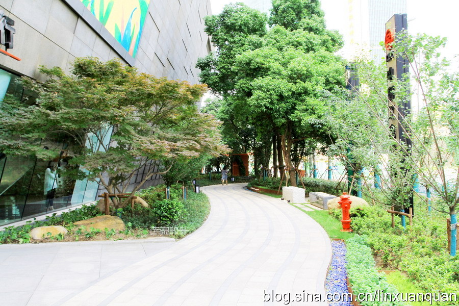 金磚大廈西側道路僅保留4M作為消防車道,增加3M寬綠化帶,設置林蔭路。