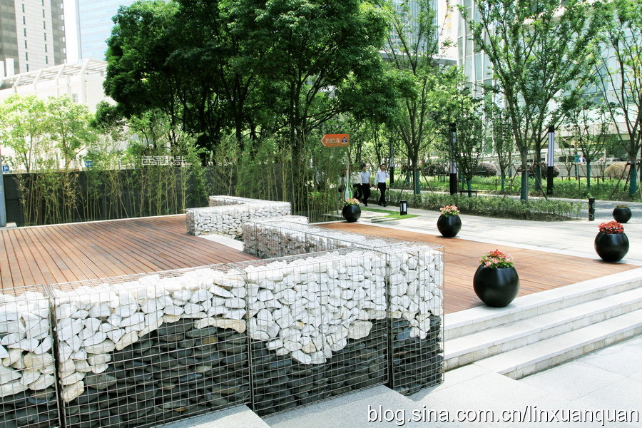 林蔭健身步道的休閑空間,置入石籠墻與坐凳,純粹的河石、樸拙的景墻與周邊的商務樓形成強烈對比,形成自然與時尚、鄉(xiāng)土與現(xiàn)代的矛盾、融合。在南方天然河道里,人工精心挑選天然的黑、紅、白色河石,堆砌出自然石墻肌理,并用細不銹鋼筋網(wǎng)片筑成籠罩固定。