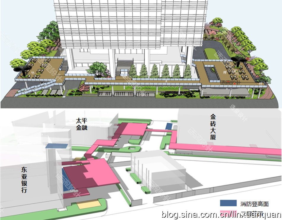 以東亞和太平金融街坊路為例,東亞銀行東側界面狹窄,為停車場和綠化。通過共享消防與物流通道,各自綠地空間增加3m寬。