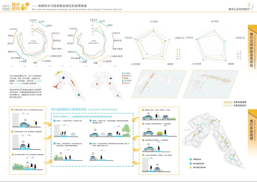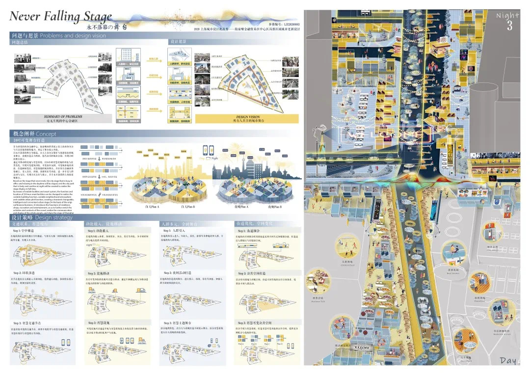 方案設計說明:本方案以基于數(shù)據(jù)實時反饋的自主街區(qū)為主題,通過構建自主交通、自主活力和自主城市大腦三大系統(tǒng),引入膠囊巴士、交通管理系統(tǒng)、智能可變鋪裝、智能活力細胞、底層分時開放、城市大腦和信息共享平臺,以提升該地區(qū)的空間活力;系統(tǒng)的運轉基于場地的時空需求進行實時調(diào)整,進行可持續(xù)的漸進式更新。