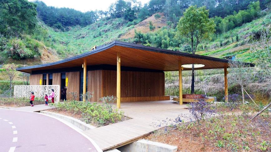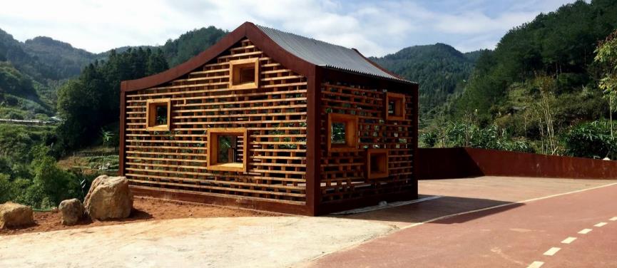 設(shè)計抽象提煉了大田國家級歷史文化保護建筑“土堡”來進行鄉(xiāng)土文化傳承,用“虛實相間”的木網(wǎng)格象征土堡的土墻、 “米斗狀”的木窗象征土堡的瞭望窗,鋼管形成土堡的屋檐。會隨時間變化的紅色銹鋼來象征大田特有的“紅壤”并融入周邊環(huán)境。