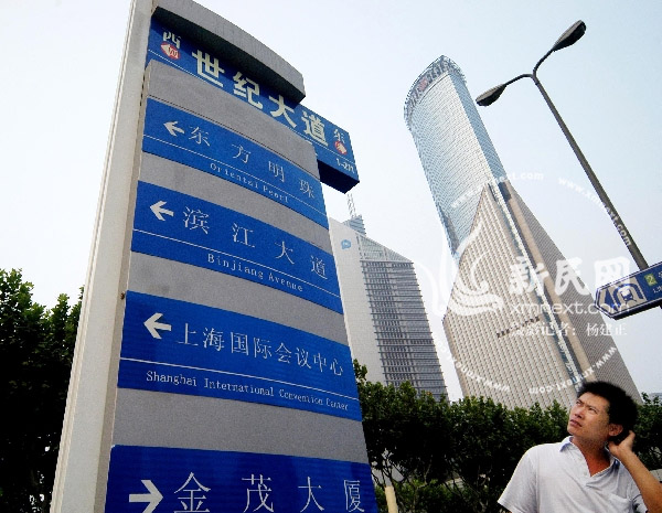以世紀(jì)大道上的一塊新型路牌為例,該路牌頂部用黃色標(biāo)記寫著“東世紀(jì)大道西”。在“東”字的下方還表著“271—1”,意為東面是門牌號為271號到1號的建筑。路牌的中部則標(biāo)明了附近三個主要的建筑———東方明珠、上海海洋水族館和上海國際會議中心的方向。路牌的反面是一張小陸家嘴區(qū)域彩色地圖。