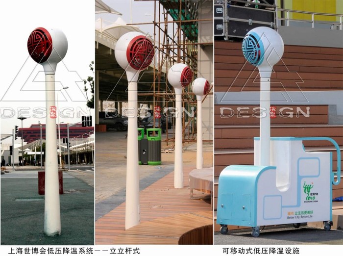 依據(jù)人體舒適度模型以及實驗表明,霧噴降溫設備宜結合遮陽設施布置降溫效果明顯好于太陽直射下的場地降溫效果。而世博場地降溫系統(tǒng)設計采用了“低壓兩相流噴霧降溫系統(tǒng)”,霧噴降溫設備根據(jù)水霧蒸發(fā)吸熱的原理,以水為原料,利用設備壓力,使水通過微孔撞擊霧化,形成自然水霧,以達到降低局部空間的環(huán)境溫度的效果。由于結合風力輸送,低壓兩相流霧噴技術相比高壓霧噴技術,具備影響人體舒適度因子中除了“溫度、濕度”外,增加了“風速”這一因子,故而,基于人體舒適度的“降溫”效果是更顯著的。