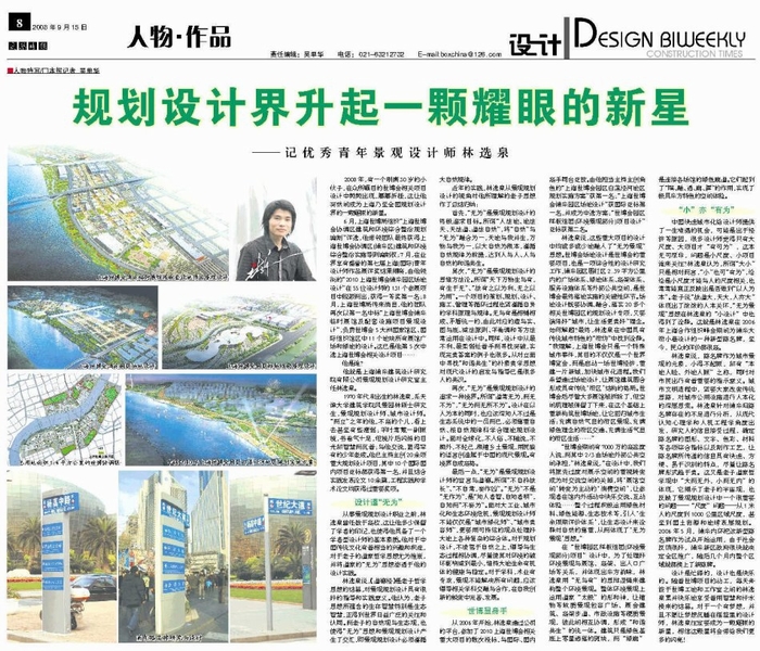 1970年代末出生的林選泉,系天津大學(xué)建筑學(xué)院風(fēng)景園林碩士研究生,景觀規(guī)劃設(shè)計(jì)師、城市設(shè)計(jì)師。“而立”之年的他,不高的個(gè)兒,看上去甚至有些瘦弱;平時(shí)常戴一副眼鏡,書卷氣十足,但鏡片后閃爍的目光卻智慧而沉著;與他交流,顯得罕有的少年老成。他已主持主創(chuàng)20余項(xiàng)重大規(guī)劃設(shè)計(jì)項(xiàng)目,其中10個(gè)國(guó)際國(guó)內(nèi)項(xiàng)目競(jìng)標(biāo)都獲得第一名,并且結(jié)合實(shí)踐發(fā)表論文10余篇,工程實(shí)踐和學(xué)術(shù)論文均獲得過(guò)重要獎(jiǎng)項(xiàng)。