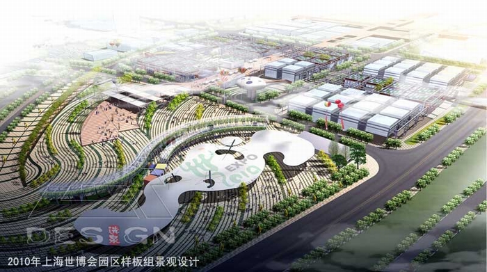 在“世博園區(qū)樣板組團(tuán)(環(huán)境景觀部分)項(xiàng)目”設(shè)計(jì)中,為了處理好環(huán)境景觀與展館、高架、出入口廣場(chǎng)等關(guān)系,并體現(xiàn)出東方韻味,林選泉用“無(wú)與有”的思辯邏輯來(lái)建構(gòu)整個(gè)環(huán)境景觀。整體環(huán)境景觀上運(yùn)用道家“太極”的形和神,讓植物等軟質(zhì)景觀包容廣場(chǎng)、展會(huì)建筑、高架步道、市政設(shè)施等硬質(zhì)景觀,彼此間相互協(xié)調(diào),形成“和諧共生”的統(tǒng)一體。建筑只是綠色基底上零星灑落的斑塊,而“綠廊”是連接各場(chǎng)館的綠色廊道。它們起到了“隔、融、透、廊、屏”的作用,實(shí)現(xiàn)了極具東方特色的空間體驗(yàn)。
