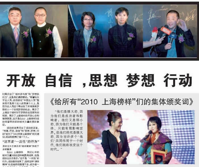 2010 年度上海榜樣關(guān)鍵詞語:熱情、開放、自信、思想、夢想、行動(dòng)