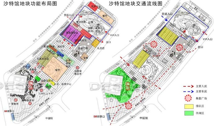 基地被人行高架分為東西兩塊。東地塊:最東側(cè)為沙特館,安檢及辦公建筑位于原沙特館入口,印度館原址設計為排隊等候區(qū),南側(cè)為休閑廣場,在排隊等候和休閑廣場南側(cè)設計有禮品店(位于沙特館出口附近)、簡餐廳,西側(cè)設計有游客服務中心和冷飲店(高架下);西地塊:尼泊爾館北部廣場東側(cè)設計有售票建筑(靠近人行高架),西側(cè)為大片的集中綠地,南側(cè)為較大的集散廣場。