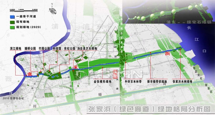 在張家浜河道周邊(東郊賓館、湯臣高爾夫球場(chǎng)、世紀(jì)公園、花木行政文化中心、上海科技館、竹園商貿(mào)中心、陸家嘴金融中心等)建立相對(duì)完整的步行、自行車通道系統(tǒng),在浦東市中心結(jié)合成一條綠色的廊道和開敞空間系統(tǒng)(圖6)。
