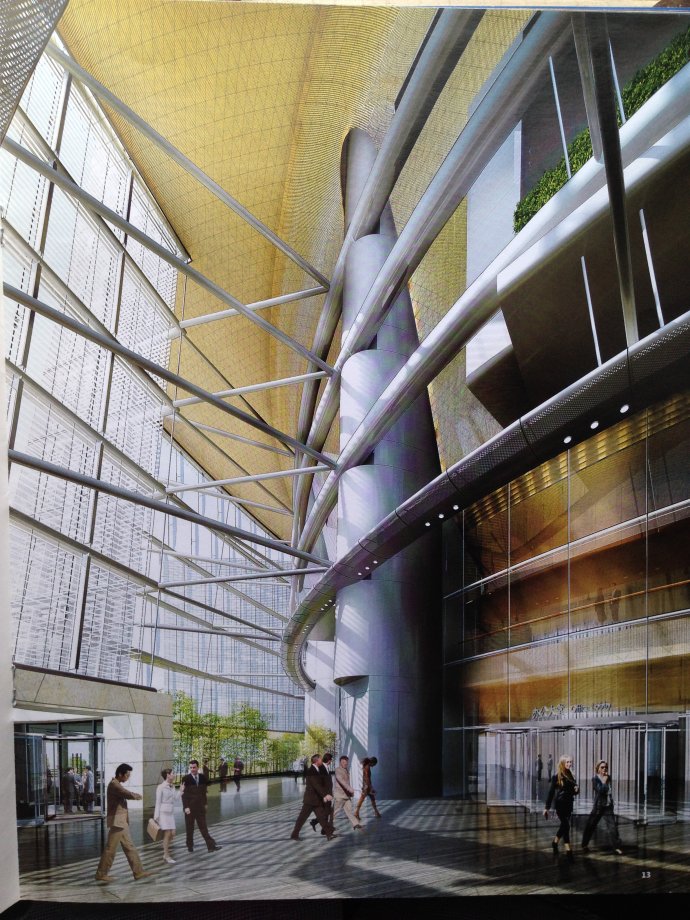 此外,2至8區(qū),每區(qū)的底部每隔120度就有一個(gè)由雙層幕墻組成的空中大堂,全樓共有21個(gè)這樣的空中大堂,大堂內(nèi)視野通透,城市景觀盡收眼底,為人們提供了舒適愜意的辦公和社交休閑空間,以及日常生活所需的配套服務(wù)。
