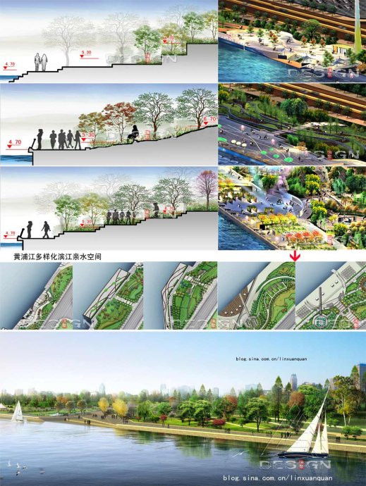 (3)濱江步道:在4.7m最高通航水位處,將4米寬的濱江步道設(shè)在這個標高上,并貫通整個濱水區(qū)域。