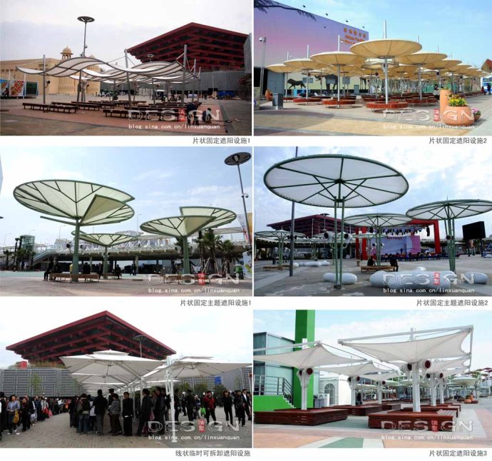 世博會服務水平與服務質量的高低的直接體現在場地中系統(tǒng)完善的配套設施,滿足人在世博圍欄區(qū)的安全而有序的活動。除了設置合理規(guī)模的四大建筑設施:餐飲、購物、功能與援助、廁所外,同時針對上海特殊的氣候條件以及有史以來最大的人流,人性化細節(jié)還體現在:遮蔭、降溫、坐椅、飲水,此外對夜景照明、標識導向等進行合理設計?,F以遮蔭降溫、坐凳、飲水為例。