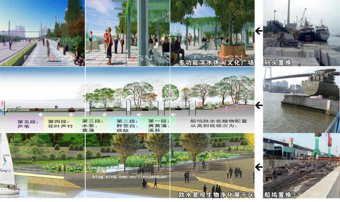 From the trend of "fear of water" in the industrial era of to the trend of "close to water" in post-industrial era, from docks and terminals in the past to the dynamic waterfront public space nowadays, all of which have shown the relationship between human and nature is harmonious and unified, rather than confrontation and conflicts. On the basis of rising the landscape concern of post-industrial era on ecological environment, the re-utilization of industrial wastes and diversification of leisure patterns[2], the planning of BJRD should focus on solving several major site problems and achieving the transformation of several concepts, namely, the relationship between flood control and water-enjoyable recreation, historical context extension, heatstroke- prevention and temperature-cooling in summer, high-density visiting flows of evacuation and assembling ,the usage problems between during and after Expo, the coordination between pump, water-gate ,bridge and environment and so on.