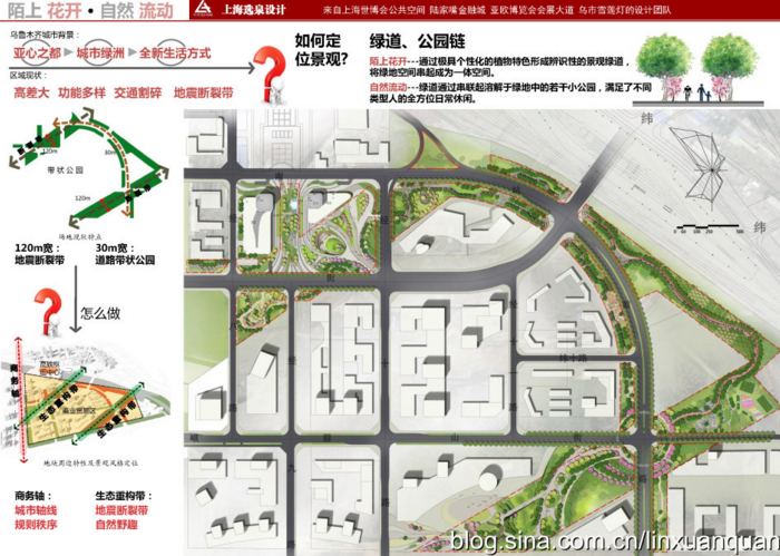 ?這些被城市道路割碎的綠地,通過場地中統(tǒng)一的林蔭綠道將整個綠地空間串起成為一體空間。并且通過極具個性化的植物特色營造,如櫻花、丁香等形成辨識性的景觀大道。