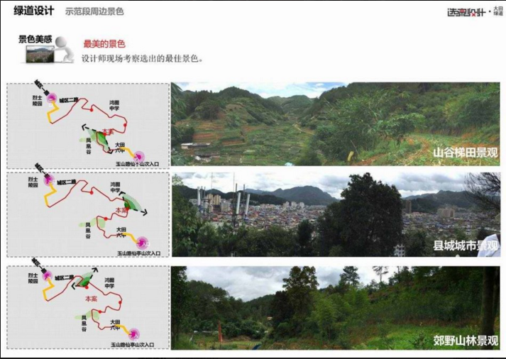 同時(shí)休息平臺(tái)又是沿線(xiàn)具有“山水城鎮(zhèn)、梯田山谷、山野林地”