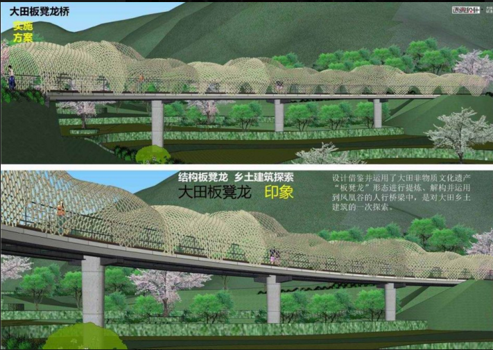 并運(yùn)用到鳳凰谷的人行橋梁、照明燈具、設(shè)施小品中,