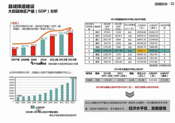 從以上數(shù)據(jù)分析可看出大田縣雖較往年有一定經(jīng)濟(jì)上的提升,可從整體經(jīng)濟(jì)水平來(lái)看,依舊處于弱勢(shì)狀態(tài),低于整體水平。—經(jīng)濟(jì)水平低,發(fā)展緩慢。