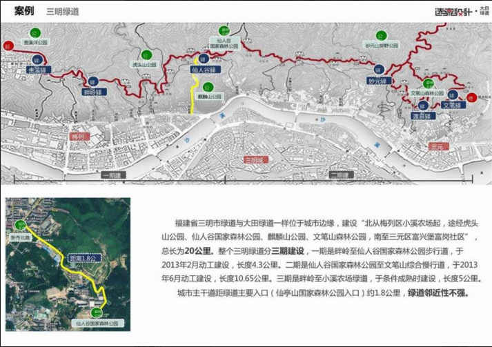 福建省三明市綠道與大田綠道一樣位于城市邊緣,建設(shè)“北從梅列區(qū)小溪農(nóng)場(chǎng)起,途經(jīng)虎頭山公園、仙人谷國(guó)家森林公園、麒麟山公園、文筆山森林公園,南至三元區(qū)富興堡富崗社區(qū)”,總長(zhǎng)為20公里。整個(gè)三明綠道分三期建設(shè),一期是畔嶺至仙人谷國(guó)家森林公園步行道,于2013年2月動(dòng)工建設(shè),長(zhǎng)度3.76公里,路面寬度4.5米。二期是仙人谷國(guó)家森林公園至文筆山綜合慢行道,于2013年6月動(dòng)工建設(shè),長(zhǎng)度10.65公里。三期是畔嶺至小溪農(nóng)場(chǎng)綠道,于條件成熟時(shí)建設(shè),長(zhǎng)度5公里。