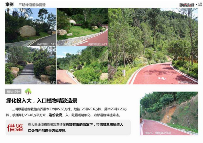 三明綠道植物栽植有喬灌木279種5.68萬(wàn)株、地被128種79.6萬(wàn)株、藤本29種7.23萬(wàn)株,噴播草籽23.46萬(wàn)平方米,造價(jià)較高。入口處景觀精細(xì)化,內(nèi)部道路栽植簡(jiǎn)潔。