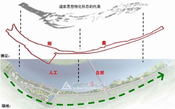 鷹潭龍虎山是中國道教的發(fā)源地,鷹潭被稱為中國道都,道教的洞天福地。濱江公園的設(shè)計理念受到道教文化的啟發(fā),提煉出“自然之道”的設(shè)計理念,以“道法自然”的生態(tài)觀和“陰陽哲學(xué)”的平衡觀,努力營造人工與自然相融合的濱水生態(tài)景觀。場地整體形態(tài)構(gòu)思源自道家思想物化形態(tài)的代表——拂塵,反映道家柔中可剛的思想,景觀形態(tài)剛?cè)岵?jì)從南到北實現(xiàn)人工向自然的逐漸演化和過渡。公園功能上分為老碼頭文化區(qū)、濱水活動區(qū)、公園游覽區(qū)、江灘生態(tài)區(qū)這四大部分,并通過“理水之道、控溫之道、植綠之道、造景之道”來讓“江、岸、城、人”有機(jī)的融合在一起,最終建設(shè)濱水景觀文化走廊、建立沿江休閑開放空間軸、構(gòu)筑城市綠色生態(tài)廊道(圖6)