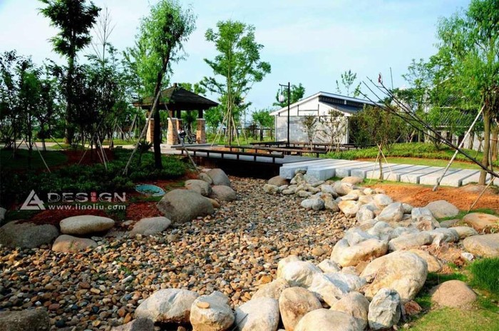 ? 軸線內(nèi)穿插了“山之園、水之園、銅之園、道之園”四大主題園。一個是具有現(xiàn)代空間形式的“現(xiàn)代景觀軸”,這兩個傳統(tǒng)與現(xiàn)代軸線交織對比,達(dá)到傳統(tǒng)和現(xiàn)代的融合與統(tǒng)一。環(huán)繞全園的步行道為交通主框架,蜿蜒的步道與旱溪(圖28)穿插其間。