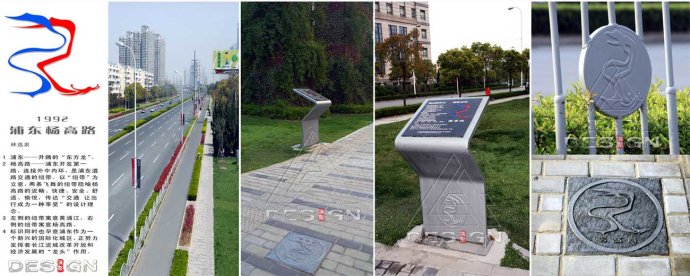 在其中的附屬設(shè)施體系中,我們創(chuàng)新性提出為楊高路創(chuàng)立“楊高路標(biāo)識(shí)”。國內(nèi)能為一條道路專門設(shè)計(jì)一個(gè)標(biāo)志的情況不多,為城市主干道設(shè)計(jì)標(biāo)識(shí),目前在上海還是首次。針對(duì)楊高路的內(nèi)涵和個(gè)性設(shè)計(jì)了7個(gè)方案,通過新區(qū)領(lǐng)導(dǎo)和公眾參與的方式確立楊高路標(biāo)識(shí) “楊高路東方龍”方案。楊高路標(biāo)識(shí)提升了道路的形象與地位,公眾參與的過程強(qiáng)化了大眾對(duì)楊高路的認(rèn)知,提升楊高路的市容景觀,增強(qiáng)其文化品味,體現(xiàn)其自身特色。