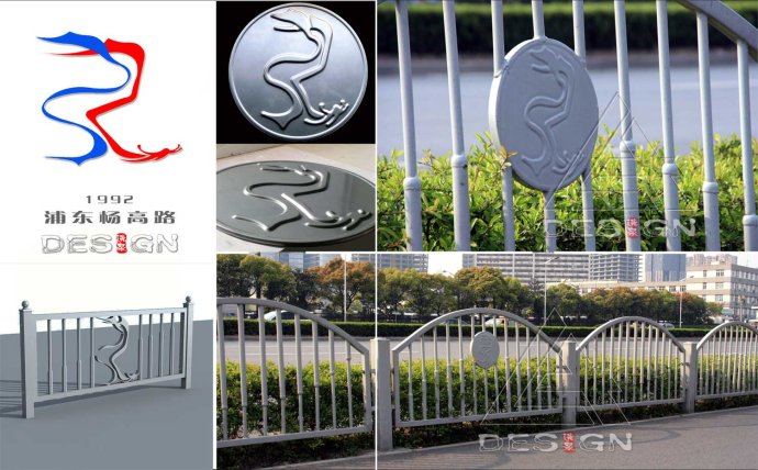 確定后的楊高路標(biāo)識(shí)運(yùn)用在道路附屬設(shè)施體系中,如道路隔離欄、人行道鋪裝等。并在楊高路人流大的(易初蓮花、東方藝術(shù)中心等)的重要節(jié)點(diǎn)設(shè)立“楊高路標(biāo)識(shí)創(chuàng)意說明牌”,讓城市大眾解讀楊高路標(biāo)識(shí)的文化與含意,在詮釋中加深楊高路道路文化的認(rèn)同。